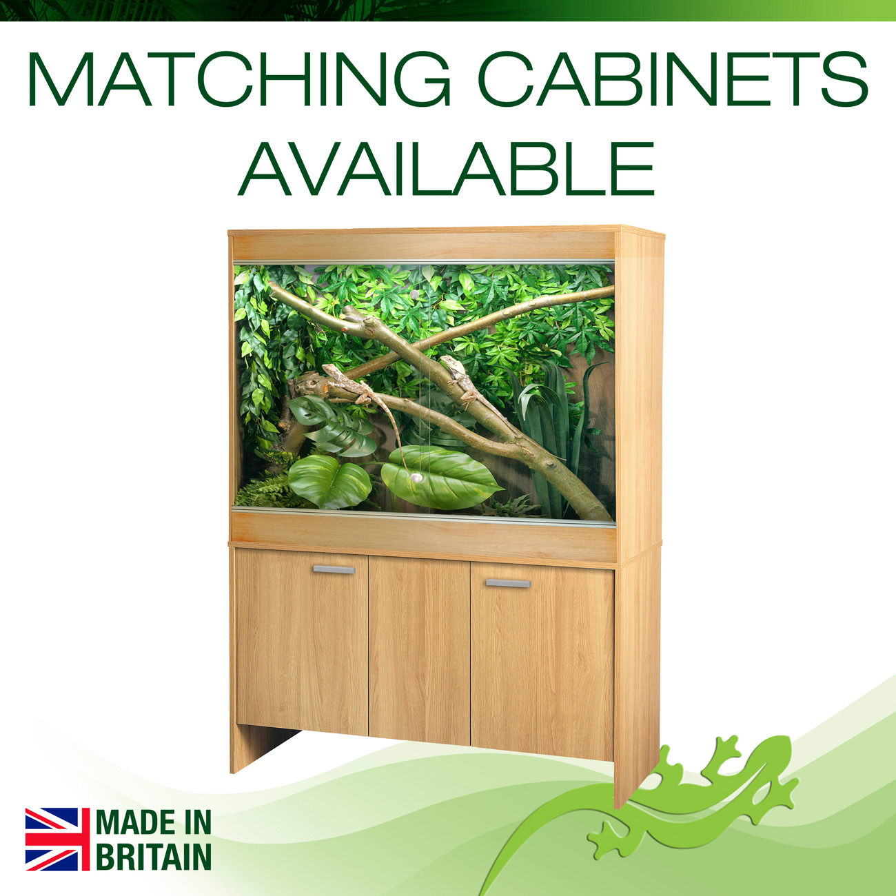 This vivarium comes in three colours: black, grey and oak, and can be fitted on top of a matching cabinet (sold separately)